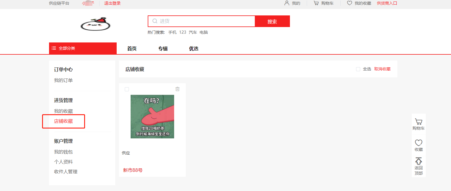 3) 右侧悬浮导航栏中的收藏,点击之后会进入商品收藏列表。