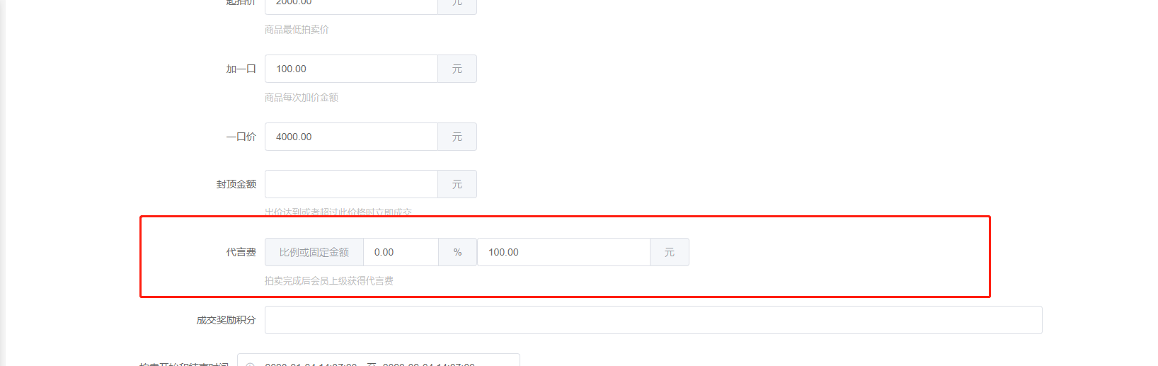 8、代言费,自定义比例或固定金额,竞拍成功的会员上级获得代言费,成交价*自定义比例