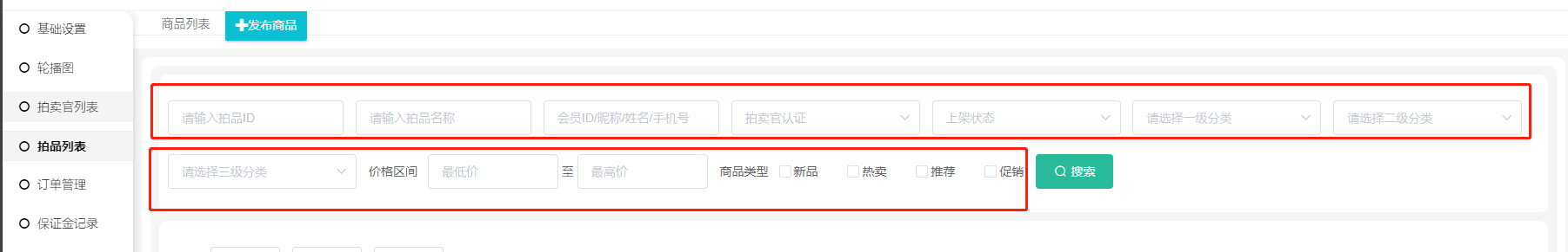 2、可以按拍品ID(拍品ID搜索框可按商品名称搜索商品 )、会员ID昵称/姓名/手机号、拍卖官认证、上架状态、商品分类、价格区间、商品类型,搜索查看商品;